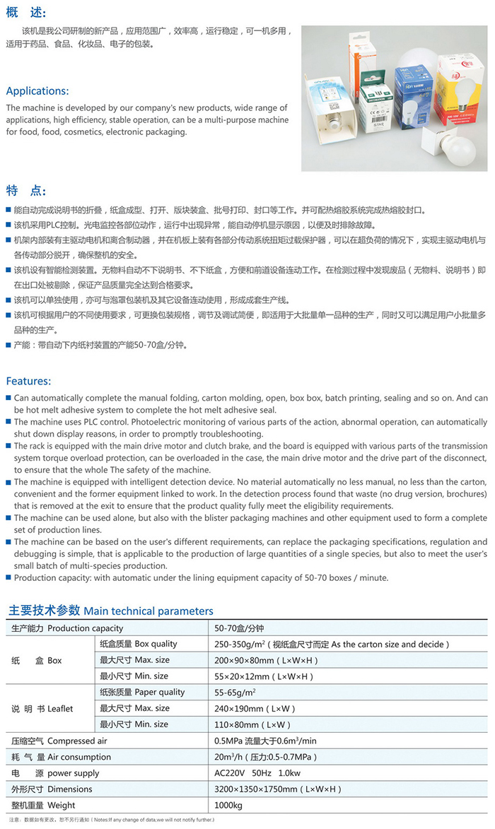 該機是我公司研制的新產(chǎn)品,應(yīng)用范圍廣。效率高。運行穩(wěn)定,可一機多用適用于藥品、食品、化位品、電子的包裝。